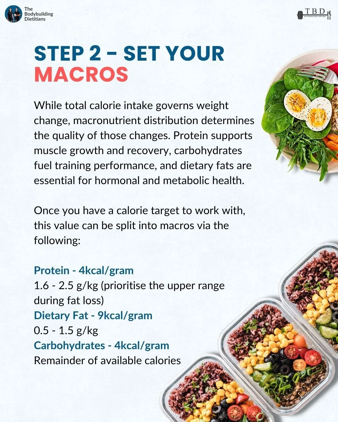 Carbohydrates (4 kcal/g): Fill the remaining calories. Key for fueling performance.