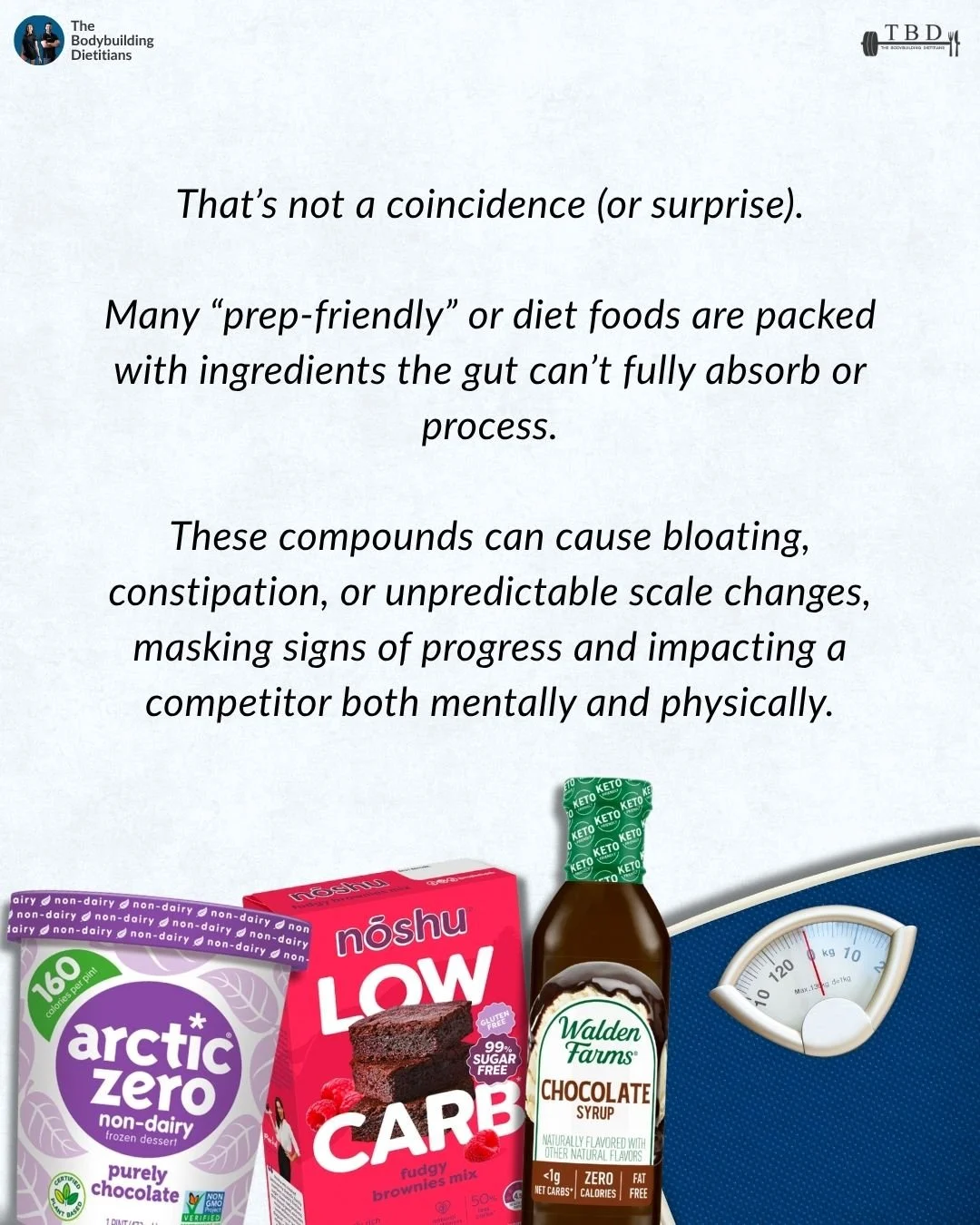 If you’re regularly consuming foods like protein bars, sugar-free syrups, diet ice-cream, or “low-calorie” sauces during prep, and then experiencing bloating, gas, or inconsistent scale readings, it’s not a coincidence.
