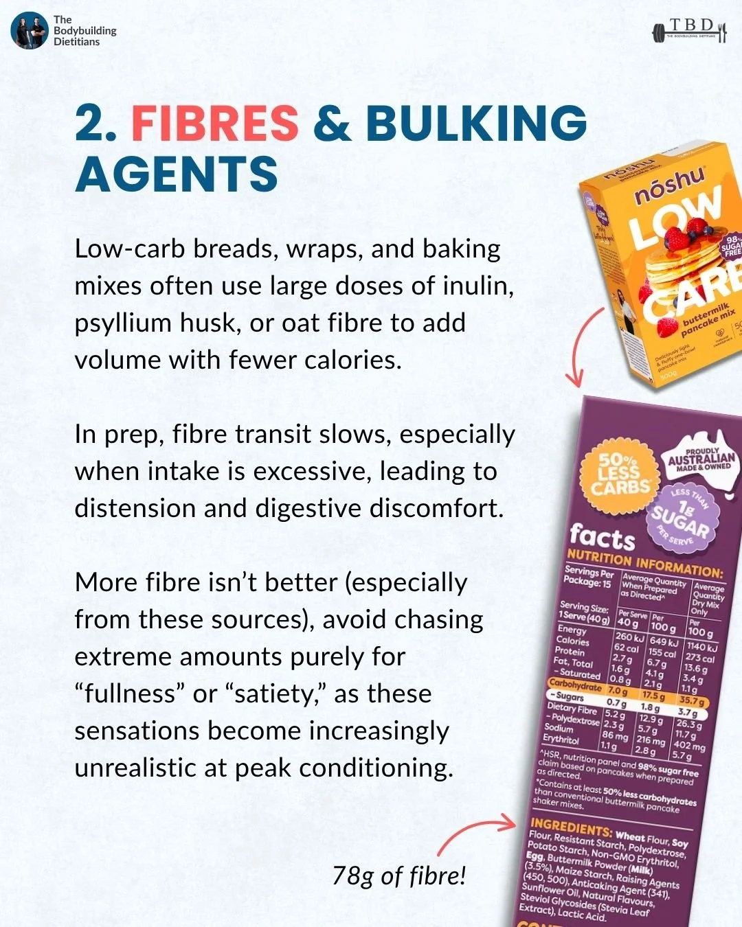 “Low-carb” and “high-fibre” products often include inulin, psyllium husk, oat fibre, or polydextrose to increase volume without adding calories. In moderation, these can support satiety, but during prep, fibre transit slows naturally. Excessive intake can worsen bloating, slow digestion, and even cause constipation.
