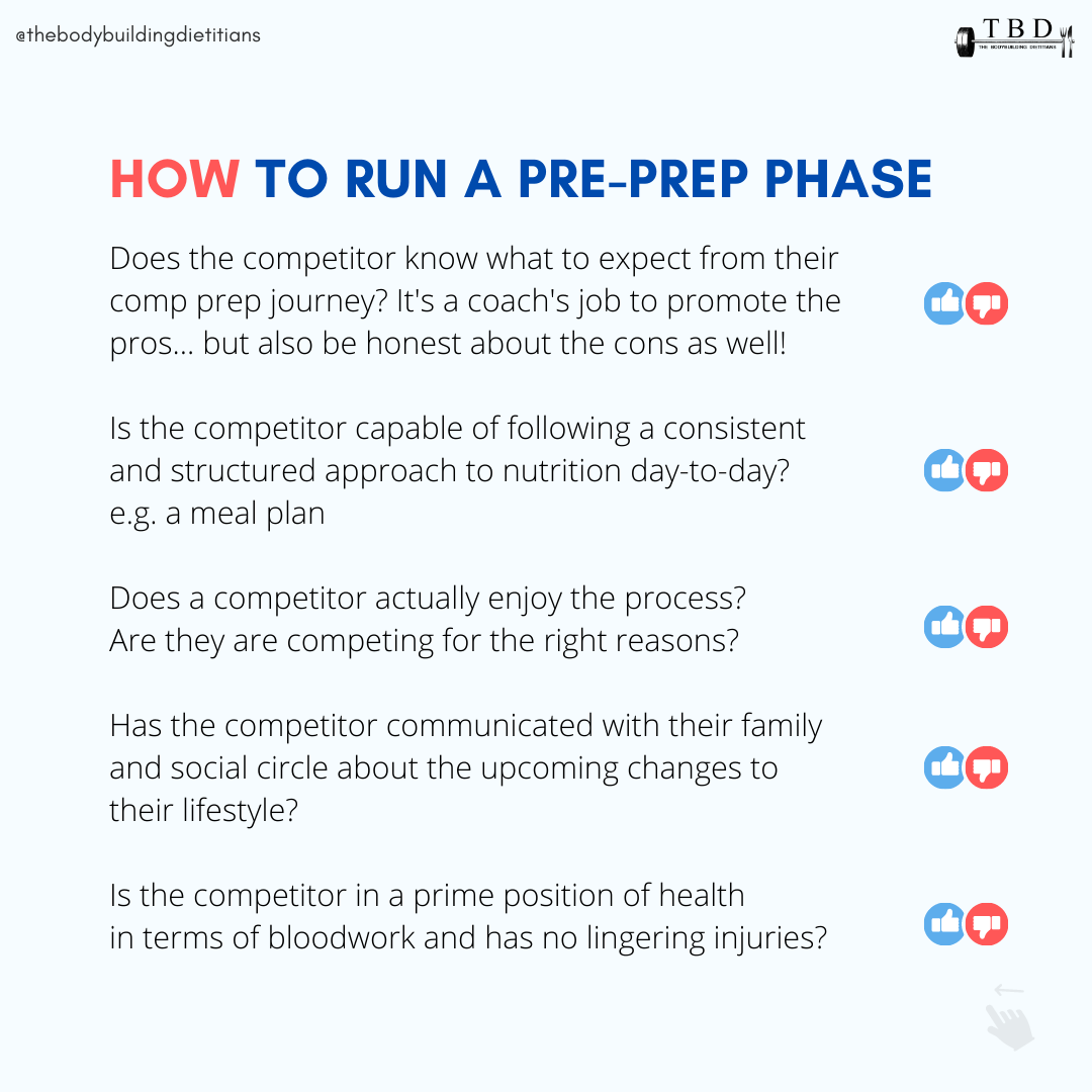 Given this, the primary purpose of a pre-prep phase is to essentially allow for a smooth transition into comp prep. Realistically, at the commencement of comp prep following a pre-prep, only a few components of a competitor’s daily actions should change including: