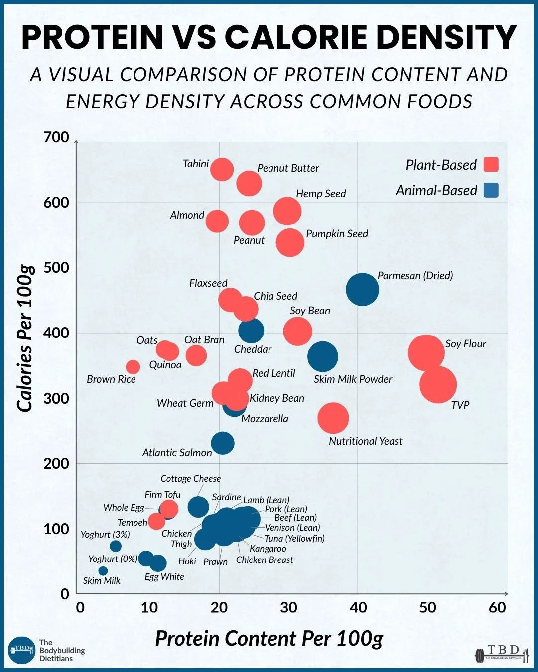 The visual comparison of protein content per 100 grams plotted against calories per 100 grams highlights a simple principle: the most efficient protein sources cluster in the lower calorie, higher protein region of the graph.