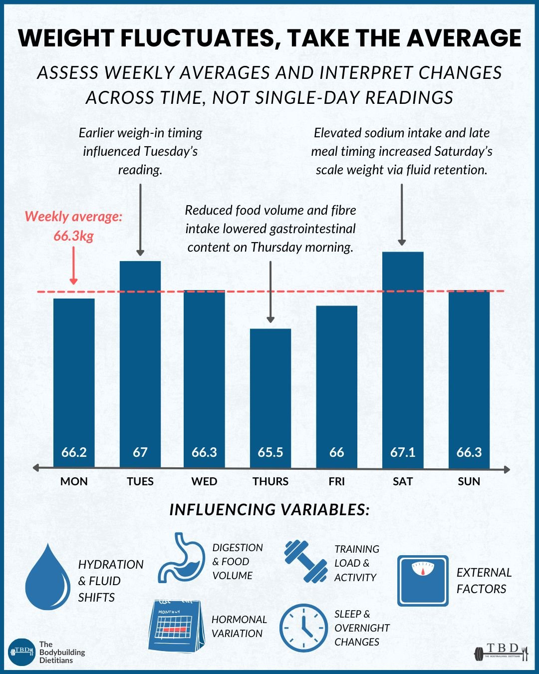 In the example shown, daily readings range from 65.5 kg to 67.1 kg. The weekly average sits at 66.3 kg. That mean value provides a far more accurate representation of underlying tissue change than any single morning measurement.