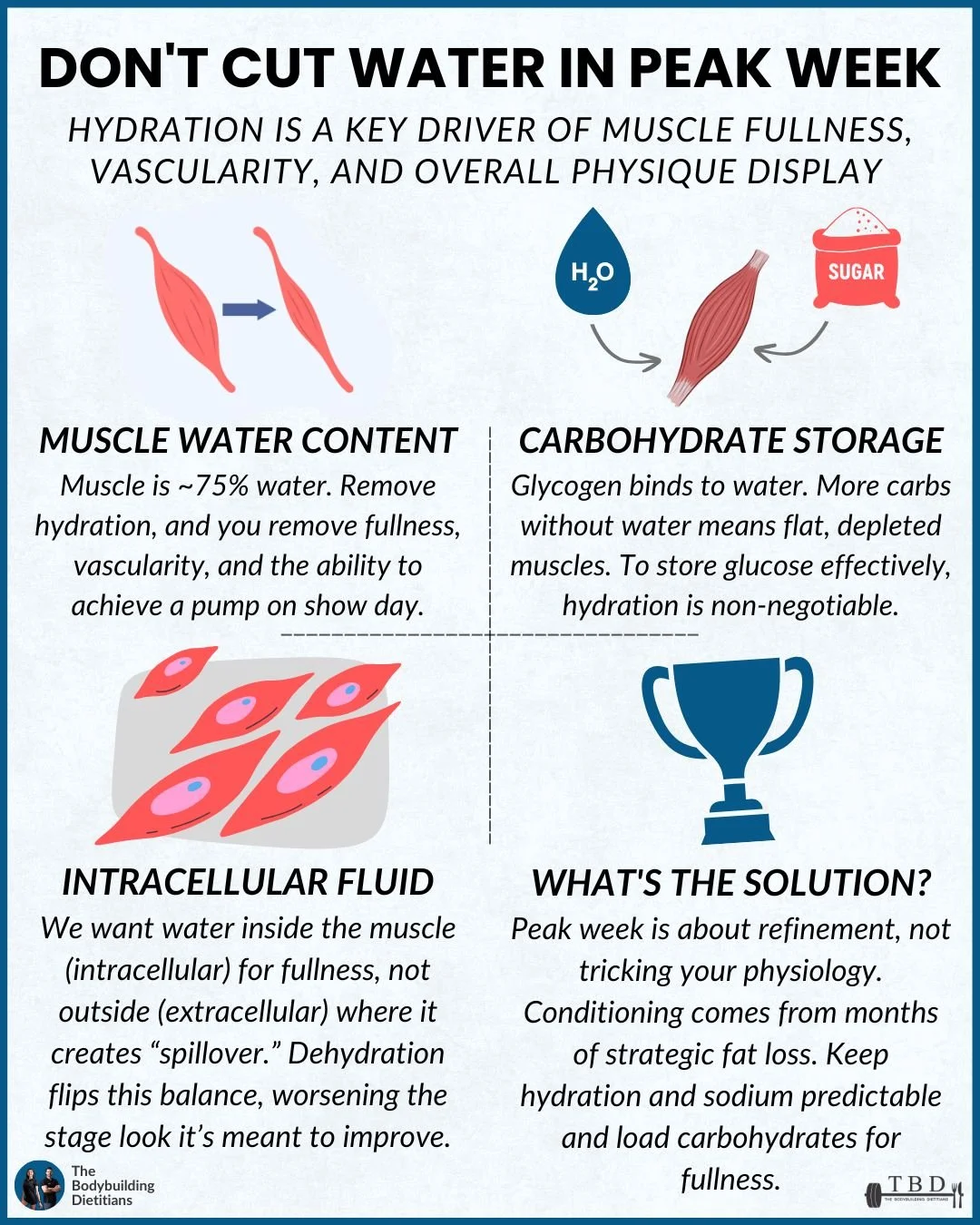 The goal in peak week is to keep water inside the muscle (intracellular) where it drives fullness, not outside the muscle (extracellular) where it creates “spillover.” Dehydration flips this balance, worsening the very look athletes are trying to improve.